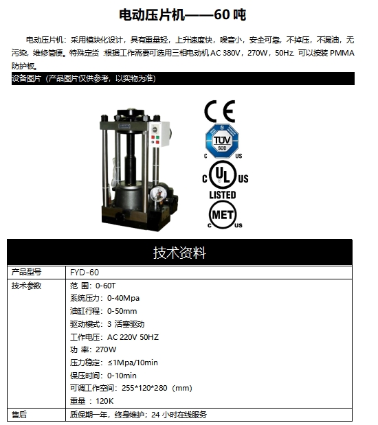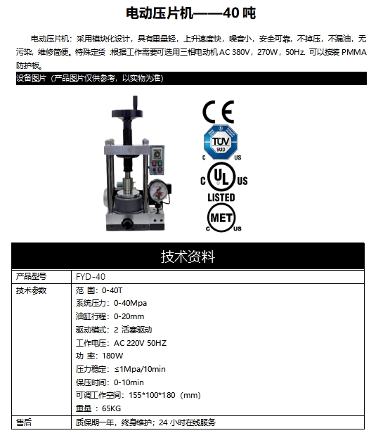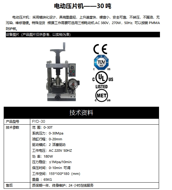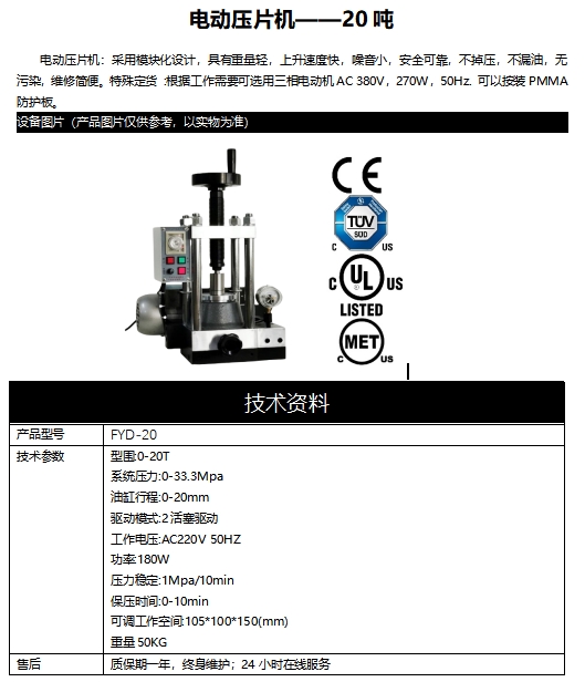 電動(dòng)壓片機(jī):采用模塊化設(shè)計(jì),具有重量輕,上升速度快,噪音小,安全可靠,不掉壓,不漏油,無污染,維修簡(jiǎn)便。特殊定貨 :根據(jù)工作需要可選用三相電動(dòng)機(jī)AC 380V,270W,50Hz. 可以按裝PMMA防護(hù)板。